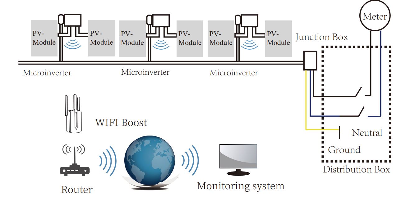 -Her bir PV modülünü, modül sayısı, yönü, farklı türü ve güç oranı gibi herhangi bir kombinasyonda kurabilirsiniz. AC kablosunun Topraklama kablosu (PE), Mikro İnvertörün içindeki şasiye bağlanır ve bu da topraklama kablosu kurulumunu ortadan kaldırır (yerel yönetmeliklere bakın). Veri toplama, dahili Wi-Fi kullanır; Mikro İnvertörün yakınında kablosuz yönlendiriciye ihtiyaç vardır. Mikro İnverter kurulumunu tamamladıktan sonra, dahili Wi-Fi ile kablosuz yönlendiriciyi yapılandırın (Wi-Fi kullanım kılavuzuna bakın). Veriler otomatik olarak yüklenecektir. Kullanıcılar, ilgili web sitesi veya uygulama aracılığıyla Mikro İnverter'ı izleyebilir ve yönetebilir. Mikro İnverter Tanıtımı